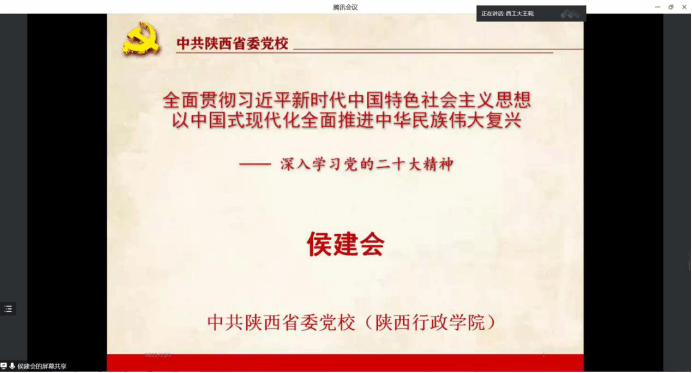 12月1日,激情视频 邀请中共陕西省委党校(陕西行政激情视频)侯建会教授作党的二十大精神专题辅导报告。辅导报告通过线上视频的方式开展,激情视频党委书记王莉主持,激情视频领导班子成员、教职工党员、学生党员代表共计100余人参加本次报告会。