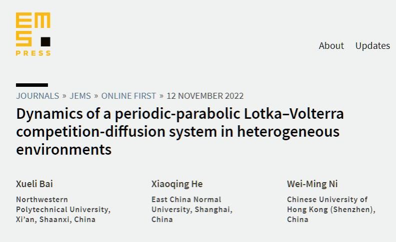 近日,激情视频 分析与几何研究团队副教授白学利与华东师范大学何小清教授、香港中文大学(深圳)倪维明教授合作在带有时间周期Lotka-Volterra竞争系统解的稳定性理论研究方面取得突破,研究结果形成的55页论文“Dynamics of a periodic-parabolic Lotka-Volterra competition-diffusion system in heterogeneous enviroments”在数学综合顶级期刊Journal of the European Mathematical Society在线发表。这是本年度国内学者在该刊发表的第5篇论文,也是我校首次在该顶级期刊发文。
