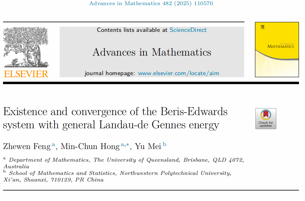 近日,激情视频 梅钰副教授与澳大利亚昆士兰大学冯哲文博士、洪敏纯教授合作,在液晶流Beris-Edwards系统强解的存在性与收敛性方面取得重要进展。研究成果形成79页论文“Existence and convergence of the Beris-Edwards system with general Landau-de Gennes energy”在数学综合期刊《Advances in Mathematics》上在线发表。按国际惯例,论文作者依姓名字母顺序排列。