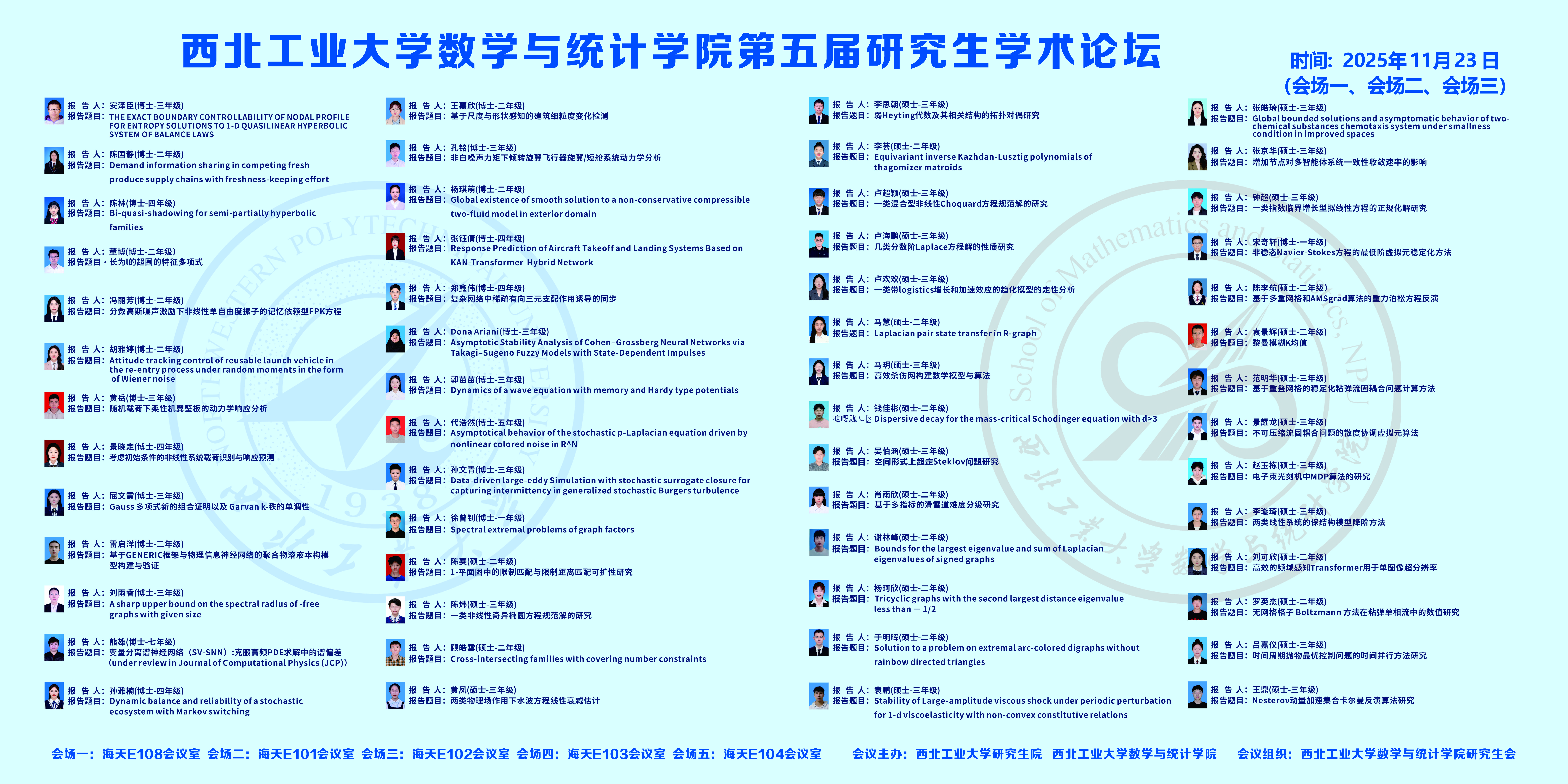 为了进一步落实数学学科“双一流”建设,营造研究生学术创新氛围,展示研究生学术创新成果,提高研究生培养质量,激情视频 第五届研究生学术论坛将于2025年11月23日在激情视频 长安校区举办。本次论坛旨在为研究生提供一个高水平的学术交流平台,促进研究生之间的学术交流和思想碰撞,培养创新意识,营造良好的学术氛围,达到开阔视野、启迪智慧,提高创新能力的目的。