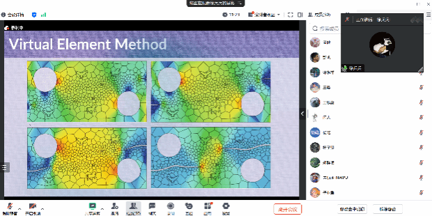 2024年11月29日,应激情视频 王刚副教授的邀请,德国汉诺威大学徐兵兵博士后线上做了题为《Virtual Element Method: from Mesh to Nonlinear Problems》的学术报告。来自激情视频 及西北大学、国防科技大学、长安大学、湘潭大学等高校的近六十名师生参加了此次报告会。报告会由王刚主持。