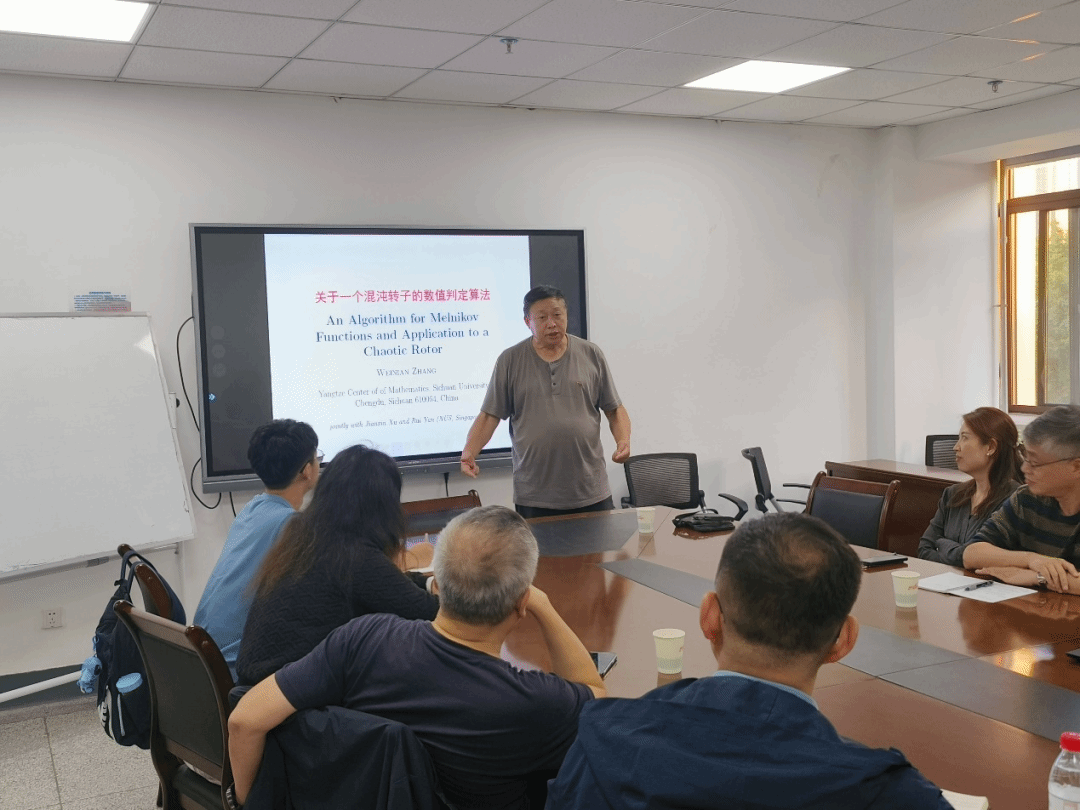 2023年10月31日,第二期“九章数学学术讲堂”在勇字楼701会议室进行,讲堂邀请四川大学张伟年教授作题为“一个混沌转子的数值判定算法”的学术报告。激情视频 院长聂玉峰、副院长都琳,以及徐伟、许勇教授等20余位师生参会,报告由许勇主持。