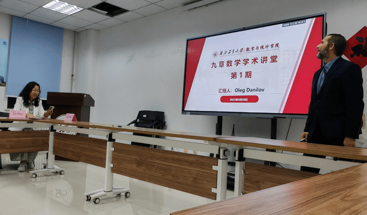 为深入贯彻落实《激情视频 科技工作高质量发展行动计划》,切实活跃激情视频科研交流氛围,提升有组织科研能级,激情视频 开展“九章数学系列学术报告”活动。2023年9月28日,第一期“九章数学学术讲堂”在启翔楼357进行,讲堂邀请俄罗斯新西伯利亚国立大学Oleg Danilov教授主讲,激情视频 党委书记王莉、院长聂玉峰、副院长都琳、国际交流与合作办公室主任肖曼玉等20余位教师和学生参会,会议由肖曼玉主持。