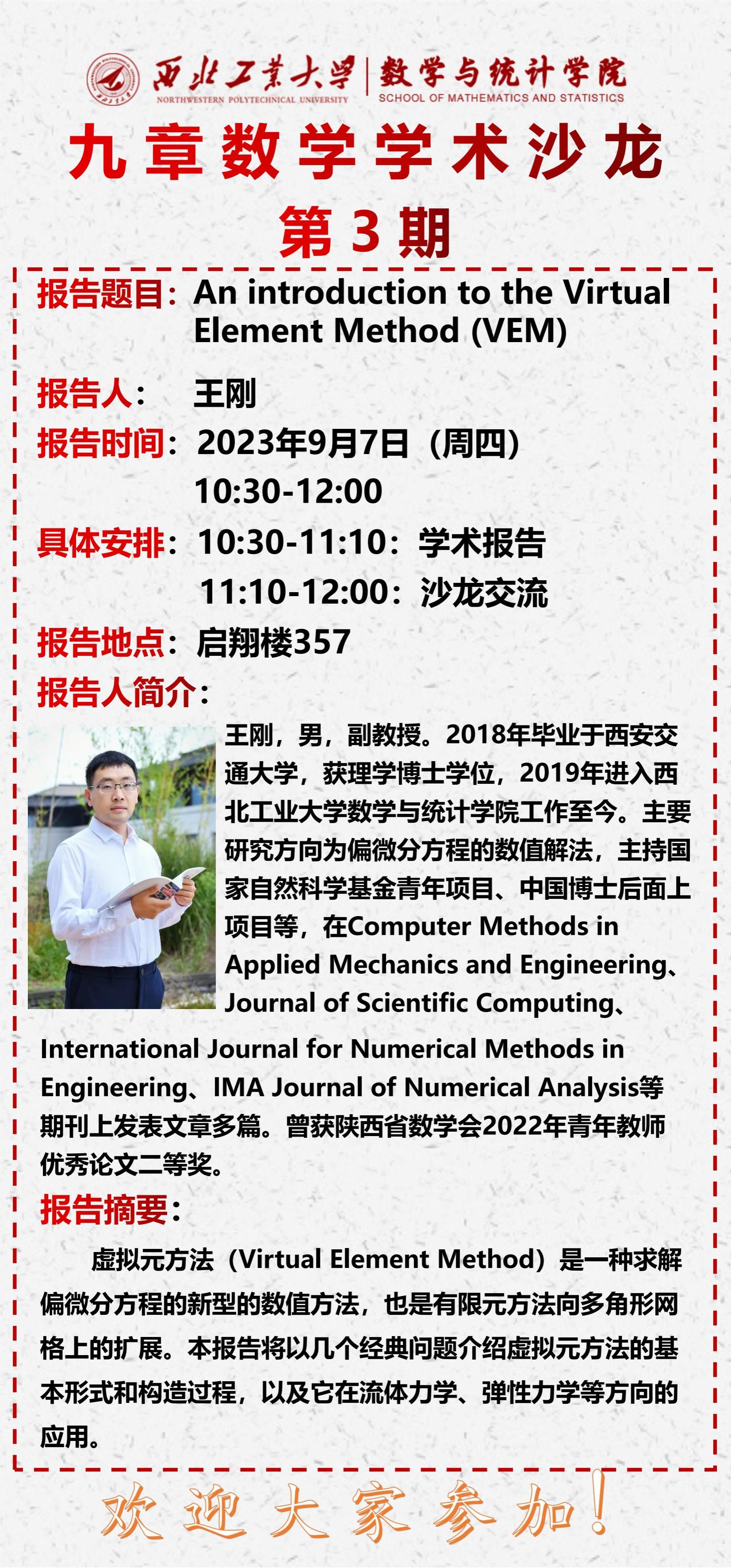 为充分贯彻落实《科技工作高质量发展行动计划》,促进激情视频 师生间的相互了解,进一步营造积极活跃的学术交流氛围,激情视频 于2023年9月7日在启翔楼357举行第三期“九章数学学术沙龙”。激情视频 王刚副教授做了题目为《An introduction to the Virtual Element Method (VEM)》的报告,都琳副院长、王晓东教授以及激情视频20余位教师和学生参加,会议由王晓东主持。