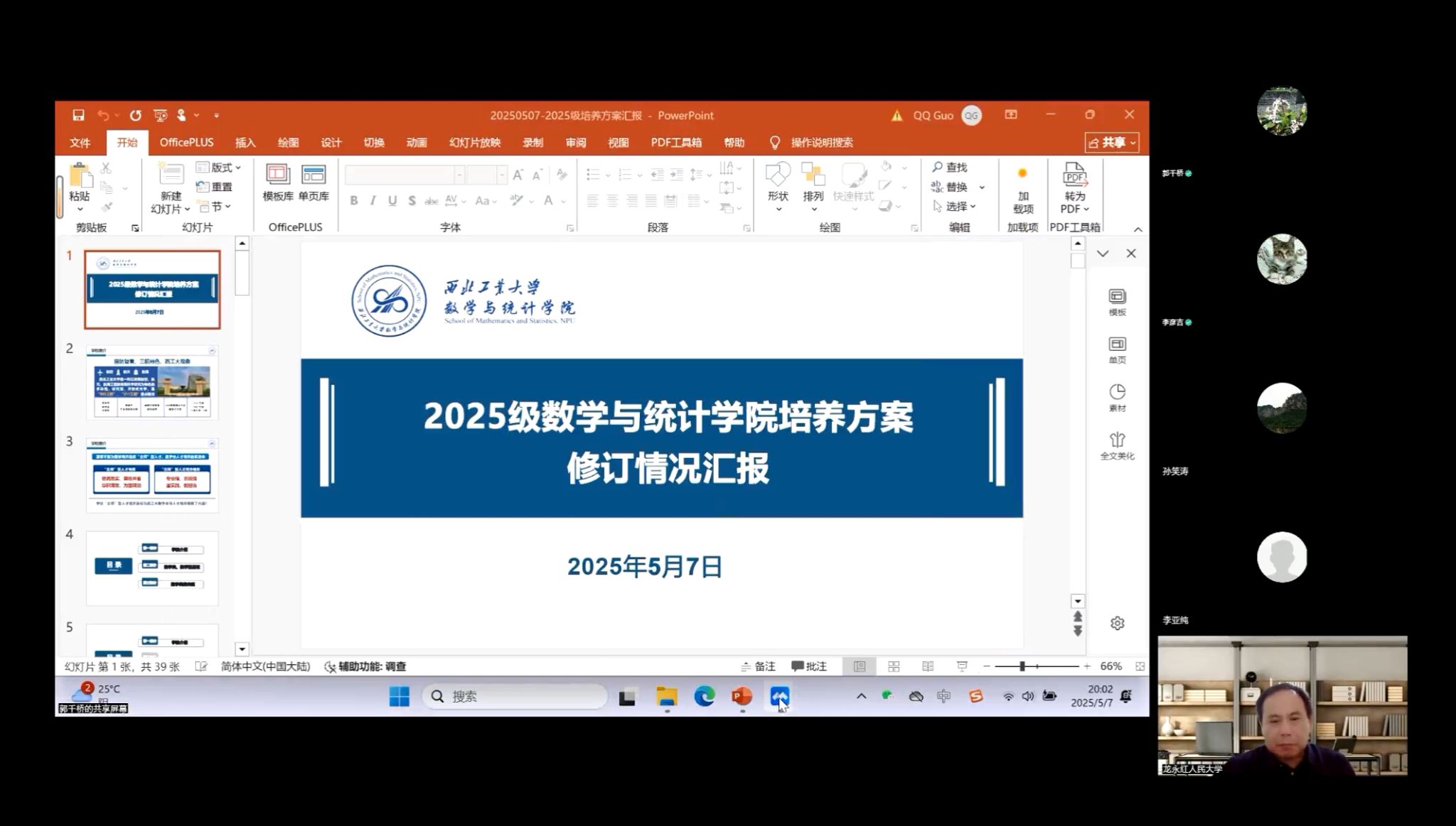 为深化教育教学改革,全面提升本科人才培养质量,推进“总师育人文化”走深走实,激情视频 于2025年5月7日晚通过腾讯会议线上召开“2025级本科人才培养方案论证会”。会议特邀教育部高等学校教学指导委员会专家——复旦大学吴泉水教授、北京大学李若教授、中国人民大学龙永红教授、西安电子科技大学刘三阳教授、天津大学孙笑涛教授、北京航空航天大学韩德仁教授及上海交通大学李亚纯教授组成论证专家组,对培养方案进行指导。激情视频院长聂玉峰、副院长郭千桥、数学科学系主任陆由、计算科学系主任赵俊锋、应用概率统计系主任王亮及教学秘书李彦吉全程参会。会议由郭千桥主持。